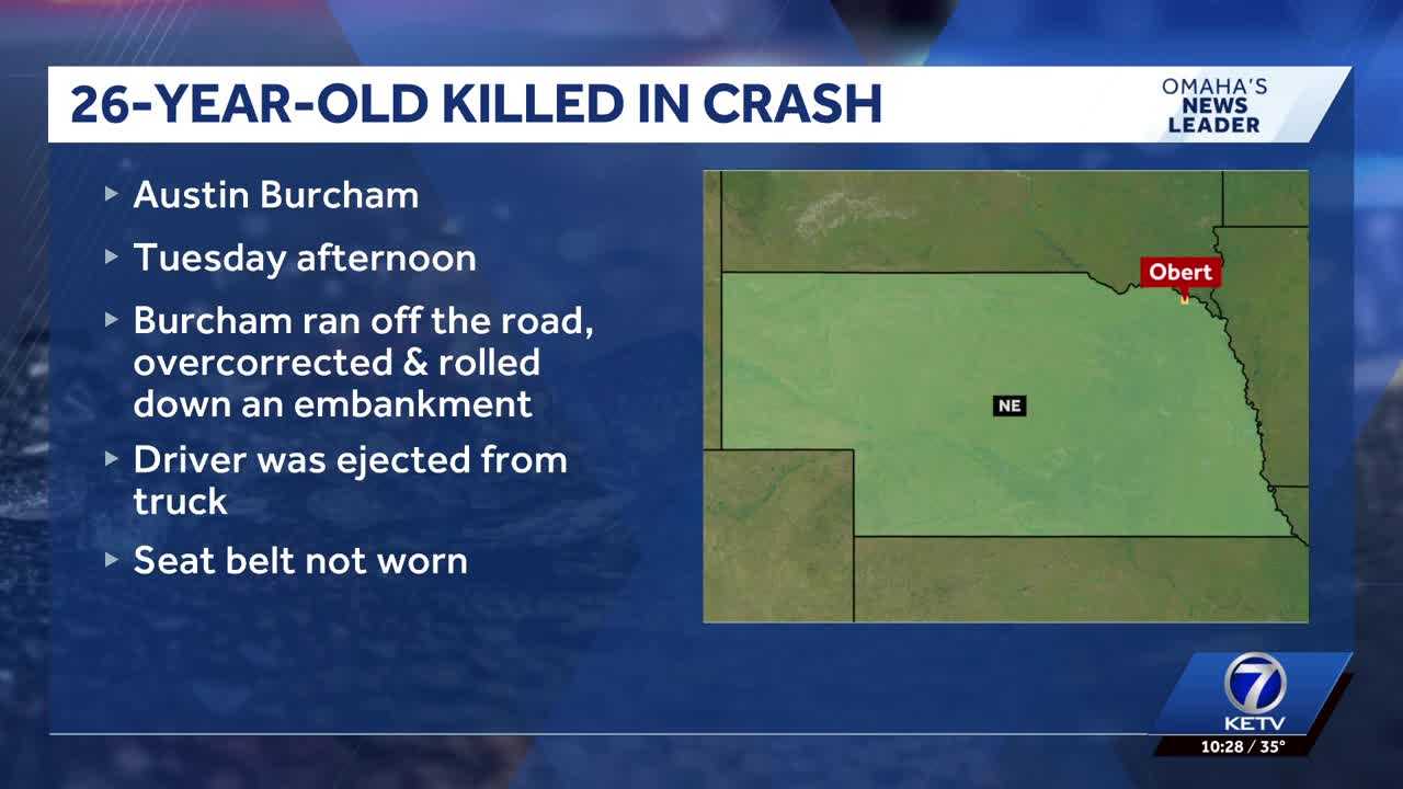 The Cedar County Sheriff’s Office confirms a man is dead after a rollover crash.The crash occurred on Highway 12, about one mile west of Obert, NE. Police identified the man as 26-year-old Austin Burcham of Newcastle, NE.Reports say Burcham ran off the roadway, overcorrected, and then rolled down an embankment. During this, he was ejected from the vehicle. Burcham was transported by Wynot EMS to Sanford Medical in Vermillion, SD, where he was pronounced dead.The crash remains under investigation by the Cedar County Sheriff’s Office. Make sure you can always see the latest news, weather, sports and more from KETV NewsWatch 7 on Google search.NAVIGATE: Home | Weather | Local News | National | Sports | Newscasts on demand |
