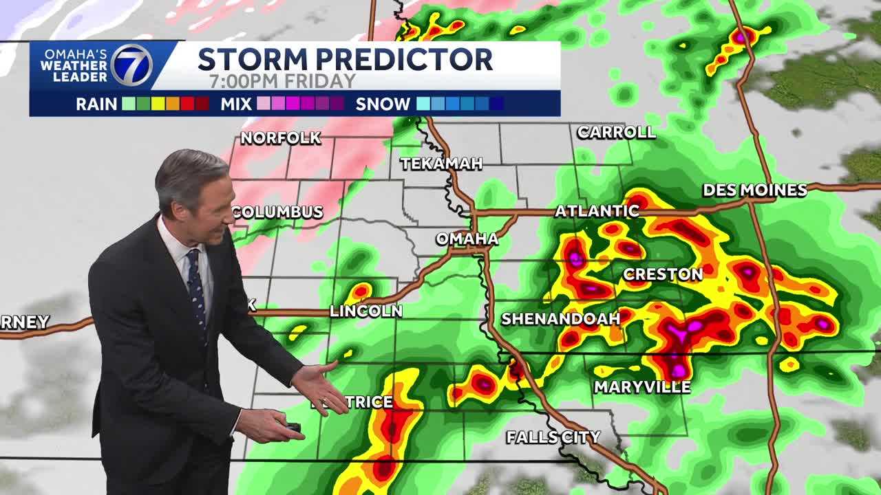 YEAH, IT’S IT’S HARSH OUT THERE RIGHT NOW IN THE OMAHA METRO. WE’RE TALKING WIND CHILL. FARTHER WEST, THERE’S SNOW AND SLEET OCCURRING. AND THIS EVENING, THE TEMPERATURES, THE PRECIPITATION MAKE IT RATHER UNPLEASANT FOR BEING AND WORKING OUTSIDE. A FACTOR OF FOUR FOR THIS EVENING. IF YOU HAVE TO GO OUT. ALL RIGHT. SO THERE IS STILL THE TORNADO WATCH THE STORM PREDICTION CENTER, THE NATIONAL WEATHER SERVICE HAVEN’T CHANGED ANYTHING, BUT THERE’S NO TORNADO THREAT IN LINCOLN. THERE’S NO TORNADO THREAT IN CASS COUNTY. POTTAWATTAMIE COUNTY. REALLY? IT’S ALONG THIS LINE AND AHEAD OF THE LINE WHEN MAYBE THERE COULD STILL BE SOME LARGER HAIL OR POSSIBLY SOME WIND OR VERY ISOLATED TORNADO. AND THEN OUT TO NORTHEAST NEBRASKA. A WINTER WEATHER ADVISORY. WE’RE GETTING SOME FREEZING RAIN AND SLEET AND THUNDER, RAIN AND SLEET. IT LOOKS LIKE ON DEUEL POLL SUPER DOPPLER SEVEN RADAR. LET’S COVER THIS FIRST. JUST SOUTH OF ATLANTIC AND CASS COUNTY. NOW A SEVERE THUNDERSTORM WARNING FOR THAT THUNDERSTORM THAT TRACKED JUST NORTH OF RED OAK. THE FOLKS IN DES MOINES PUT THAT WARNING OUT UNTIL 7:00 THIS EVENING. POSSIBLE HAIL TO ONE INCH IN DIAMETER. LOOKS LIKE IT WILL TRACK JUST SOUTH OF ATLANTIC, NOW NORTHEAST OF NEBRASKA. ALL RIGHT. THERE HAVE BEEN LIGHTNING STRIKES OUT HERE. THERE ARE 11 LIGHTNING STRIKES WITHIN THE VIEW HERE. JUST NORTH OF WEST POINT. ALSO SOUTH OF NORFOLK AND THEN AROUND COLUMBUS. AND THIS IS SNOW AND SLEET. WE LOOK AT SOME OF THE CAMERAS OUT HERE ALONG THE PLATTE RIVER, OUT THERE NEAR COLUMBUS. AND BE CAREFUL. THINGS COULD GET SLIPPERY BECAUSE OF THAT. NOW, OUR COMPUTER MODELS SUGGEST THAT GOING FORWARD, THAT’S THE BEST RISK OF THUNDERSTORMS DOWN. SHENANDOAH, MARYVILLE, CLARINDA, BEDFORD. BUT ALSO DOWN HERE SOUTHEAST OF BEATRICE. WE COULD HAVE SOME SCATTERED THUNDERSTORMS. AND EVEN IN THE METRO BY 8:00 OR SO. WE MAY GET SOME RUMBLES OF THUNDER AND POSSIBLY A LITTLE SLEET OR SMALL HAIL. LOOKS LIKE IT’S OUT OF HERE BY 10:00 OR SO, ALONG WITH THE STRONGER STORMS DOWN INTO NORTHWEST MISSOURI AND COLD OVERNIGHT. SO THIS IS I-80 OUR CAMERA AT H AND H KIA. WE’RE 37 DEGREES. WE’LL HAVE TO WATCH THAT TEMPERATURE BECAUSE IT IS DROPPING. IT HAS DROPPED DOWN TO 35 IN BLAIR AND 33 IN FREMONT, 34 STILL OUT HERE IN WAHOO, BUT IT’S BELOW FREEZING IN YORK AND COLUMBUS AND NORFOLK. AND THERE IS PRECIPITATION OUT THERE. SO IT COULD TURN ICIER WHERE THE NORTH WIND IS BLOWING PRETTY GOOD IN BEATRICE. AND NOW IN NEBRASKA CITY AND HARLAN AND EVEN ATLANTIC. THAT TAKES AWAY YOUR TORNADO THREAT. AND EVEN HERE IN FALLS CITY MARYVILLE, IT’S CLOUDY. DOESN’T SEEM LIKE STORMS ARE GETTING GOING. A COUPLE ISOLATED ONES HERE DOWN IN SOUTHWEST IOWA. AGAIN, THERE’S THE STORM WITH THE WARNING OUT. POSSIBLE HAIL HERE JUST EAST OF GRISWOLD GOING TO TRACK JUST SOUTH OF ATLANTIC. OTHER SCATTERED STORMS HERE IN PAGE COUNTY. NOT TOO FAR FROM SHENANDOAH. AND THEN AGAIN, HERE’S THAT THUNDER SLEET OCCURRING IN THE AREA AROUND COLUMBUS. SO THERE IS ANOTHER THUNDERSTORM DOWN HERE WEST OF FAIRBURY. IF THAT HOLDS TOGETHER, LINCOLN COULD GET SOME SMALL HAIL AND THE OMAHA METRO IF THAT HOLDS TOGETHER. TONIGHT’S LOW 30. STILL SOME THUNDERSTORMS AROUND THIS EVENING. WINDY, COLDER. HOPEFULLY THE PRECIPITATION ENDS IN TIME BEFORE WE GET BELOW FREEZING, AND I THINK THAT WILL BE THE CASE IN OMAHA. GET SOME SUN TOMORROW, BUT BREEZY AND CHILLY IN THE MORNING. NOT TOO BAD IN THE AFTERNOON. SPRING FORWARD ONE HOUR SATURDAY NIGHT SUNDAY. REALLY PRETTY NICE IN THE AFTERNOON. ALTHOUGH IT WILL BE BREEZY. WE’LL HAVE SOUTHWEST WIND 15 TO 25 MILES AN HOUR. LIGHTER WINDS ON MONDAY AND LOW 70S. THAT LOOKS REALLY NICE. THERE. ARE YOU ARE YOU THROWING OUT THE MONDAY HOOKY ALERT OR ARE YOU