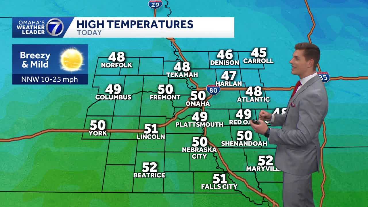 METEOROLOGIST LUKE VICKERY. WITH THE ACCURATE FORECAST, YOU CAN TRUST. IT’S ANOTHER WARM DAY OUTSIDE TODAY, BUT NOT AS WARM AS IT WAS YESTERDAY. BORDERLINE HOT. YESTERDAY, YOU COULD SAY, WITH TEMPERATURES IN THE AFTERNOON GETTING TO THE MID 70S IN OMAHA, 75 DEGREES, BREAKING THE PREVIOUS RECORD HIGH TEMPERATURE SET BACK IN 1954 OF 63. SO WE CRUSHED THAT RECORD BY 12 DEGREES. AGAIN NOT AS WARM TODAY AFTER A FRONT CAME THROUGH YESTERDAY EVENING. AND THE WARM TEMPERATURES HAVE BROKEN UP SOME ICE ALONG THE PLATTE, ELKHORN AND LOUP RIVERS. BUT IT LOOKS LIKE THE PLATTE RIVER THAT’S SEEING SOME OF THAT ICE FLUSH OUT. BUT NOW THE UPPER LEVELS OR THE UPPER PART OF THE ELKHORN ALSO THE LOUP RIVER OVER BY COLUMBUS. STILL A FLOOD. WATCH UNTIL 1:00 TOMORROW. LIVE. LOOK OUTSIDE SOME HIGH AND MID LEVEL CLOUDS STREAMING OVERHEAD. THAT’S OUR LOOK FROM THE HENRY DOORLY ZOO. 42 DEGREES, A LITTLE BIT BREEZY OUT OF THE NORTH NORTHWEST AT 21MPH. THAT BREEZE WILL EASE UP A LITTLE BIT MORE THE LATER WE GET INTO THE AFTERNOON. INTO THE EVENING. 42 FOR OMAHA 46. LINCOLN 42 FOR FREMONT, 39 ON THE MAP IN ATLANTIC. BUT GENERALLY SPEAKING, WE’RE TALKING TEMPERATURES IN THE 40S OUTSIDE OF NORFOLK AT 39 DEGREES, ALONG WITH ATLANTIC LIVERPOOL. QUIET FOR US. WE’RE PROBABLY NOT GOING TO SEE MUCH ON THERE. MAYBE TOMORROW, LATE EVENING, OVERNIGHT INTO EARLY THURSDAY MORNING, WE COULD SEE A LITTLE PRECIPITATION NORTH OF US. IT’S LOOKING PRETTY LIGHT FOR OMAHA, THOUGH, IF ANYTHING. AND THERE’S THE HIGH LEVEL CLOUDS KIND OF STREAMING OVERHEAD. I THINK THOSE CLEAR OUT A LITTLE BIT MORE. HIGH PRESSURE WILL TAKE OVER DURING THE AFTERNOON AND EVENING HOURS, AND THAT’S CLEAR OUT THE SKIES. SO WE SHOULD HAVE SUNSHINE FOR THE SECOND HALF OF YOUR TUESDAY TODAY. THAT HIGH PRESSURE WILL STICK AROUND OVERNIGHT WITH CLEAR SKIES, CALM WINDS, SO COLDER NIGHT AHEAD WITH TEMPERATURES IN THE LOWER 20S. AND THEN YOUR WEDNESDAY WILL START WITH THE SUNSHINE. IN THE AFTERNOON WE’LL SEE A FEW MORE CLOUDS, A SOUTH BREEZE INCREASING A LITTLE BIT. SO ANOTHER WARM DAY TOMORROW WHERE WE THINK WE COULD GET INTO THE LOWER 50S AGAIN. HERE’S YOUR HOUR BY HOUR FORECAST JUST FOR THIS AFTERNOON. TOPPING OUT NEAR 50 DEGREES. AND THEN WE’LL GO BACK INTO THE 40S AROUND 6:00, 30 8:00 AND ONWARD. A HIGH TEMPERATURE FOR TODAY, THOUGH, 50 DEGREES AGAIN, IT’S PRETTY MILD DAY, NOT THE 75 WE HAD YESTERDAY. IT’S PRETTY REMARKABLE THAT THAT’S 25 DEGREES WARMER THAN TODAY. AND TODAY’S EVEN A WARM DAY WELL ABOVE NORMAL. WE’LL GO 24 DEGREES OVERNIGHT. AGAIN. HIGH PRESSURE WILL SETTLE IN RIGHT ON TOP OF US. USUALLY WHEN YOU GET SOME OF THOSE COOLER NIGHTS. SO MID 20S SEEMS LIKELY IN THE AFTERNOON TOMORROW, BRINGING TEMPERATURES BACK INTO THE LOWER 50S. SO AGAIN ABOUT 15 DEGREES ABOVE NORMAL FOR THIS TIME OF YEAR. AND IT LOOKS LIKE WE’LL SUSTAIN THAT HERE FOR THESE NEXT FEW DAYS. AND WE’LL KEEP TEMPERATURES UP EVEN MORE THURSDAY WHERE WE’RE AT 54. AND THEN FRIDAY AT 55 DEGREES. THERE IS A LOW CHANCE OF SOME RAIN OR MAYBE A LIGHT MIX NORTH OF OMAHA ON EARLY THURSDAY MORNING, BUT THAT’S REALLY THE ONLY PRECIPITATION WE’RE TRACKING THROUGH THE NEXT SEVEN DAYS OR SO. VALENTINE’S DAY EVEN LOOKS GOOD AT CLOSE TO THE DAY. THE SEVEN DAY FORECAST WITH TEMPERATURES IN THE UPPER 50S, AND WE’RE TALKING LOWER 60S WHEN WE GET CLOSER TO THE WEEKEND. SO A LOT OF WARMTH, A L