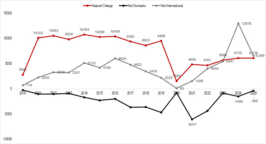 Read the full article on Nebraska Examiner New Census state population estimates are reflected in this graphic, which features components of Nebraska’s population change from 2010 to 2025. In the last year reflected, the state’s population increased by 0.61% overall, reaching an estimated 2,018,006 residents. Red represents the trend line for natural change (births and […]