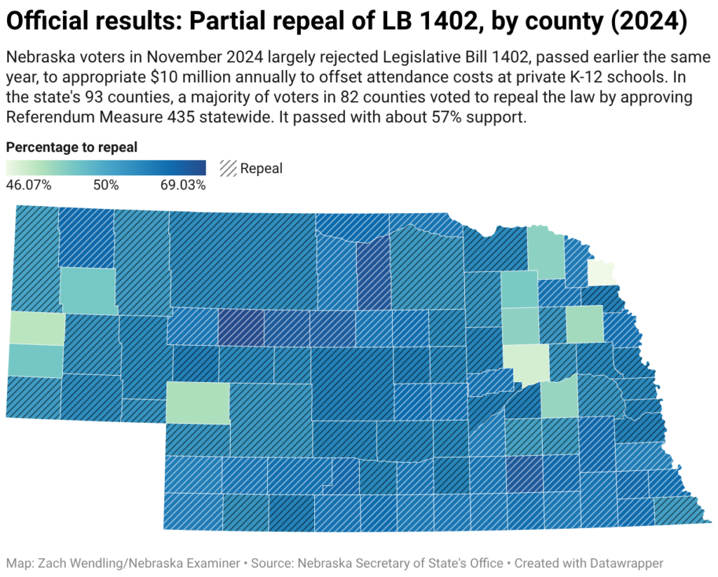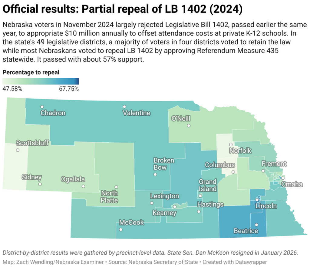 Read the full article on Nebraska Examiner Nebraska Gov. Jim Pillen, center, smiles with local private school students after ceremoniously signing a proclamation for “National School Choice Week” in the state. Jan. 28, 2026. (Zach Wendling/Nebraska Examiner) LINCOLN — A majority of Nebraska voters in 45 of 49 legislative districts repealed the state’s last program […]