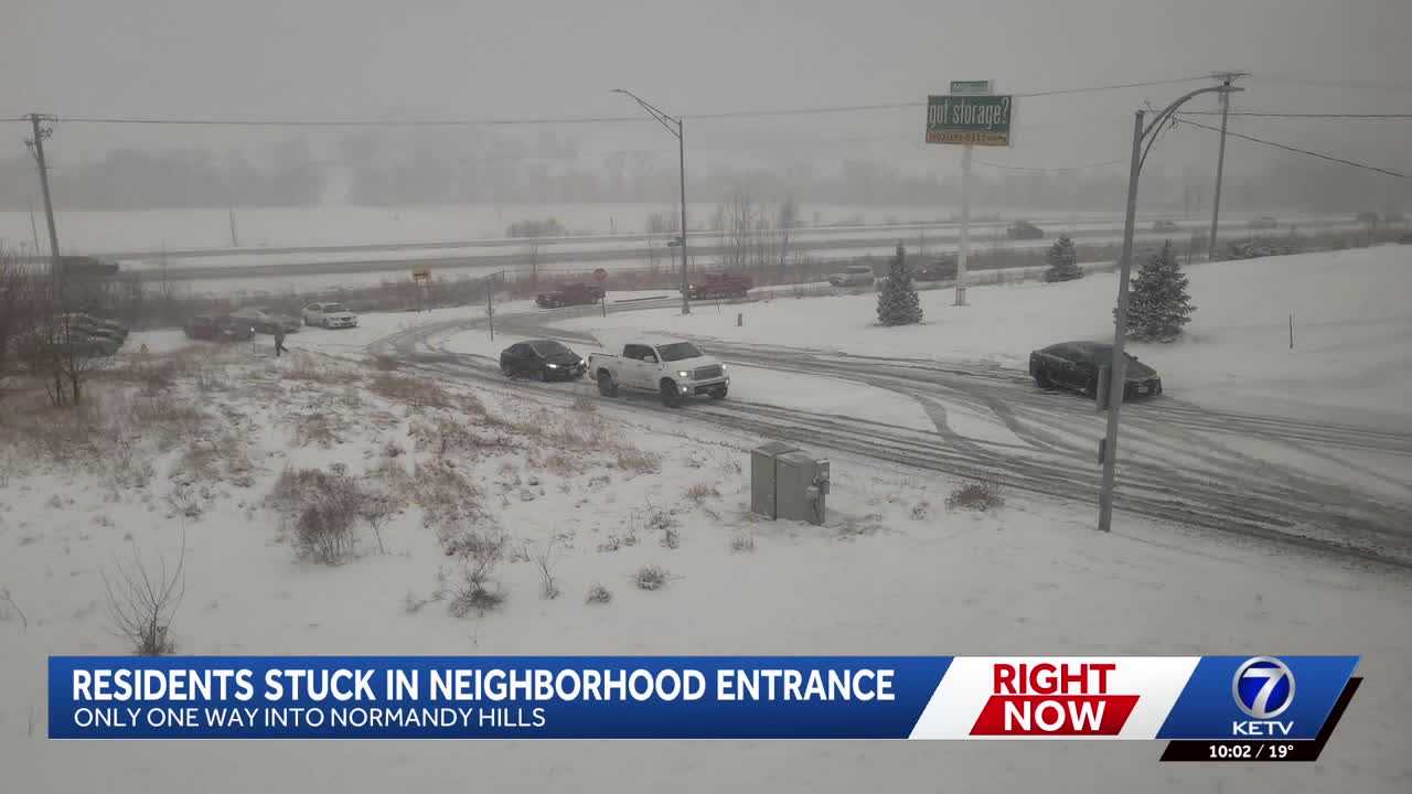 Celine Monif has lived in Normandy Hills, a neighborhood in Bellevue, for two decades. She said the entrance has been a huge problem for years.”This hill gets icy so fast, so quickly that every winter, several times a year, we get people stranded at the bottom of the hill,” Monif said.She lives right at the entrance, so she can see every time someone can’t make it up the hill. Then combine the hill with a sharp turn and add in the recent snow.”As people are coming down the hill, they’re not able to stop either, and we actually almost had a collision the other day,” Monif said.Residents don’t have any other option. This is the only entrance.”They keep telling us that we have an emergency entrance on the other side, which, if you go and investigate, you’ll find that there’s a big gate with a big padlock,” Monif said. “None of us have access to it. In fact, we don’t even know who has a key.”She said the conditions can get so bad that the turn looks more like a parking lot.”Seven people all parked and abandoned their cars down here, so they can walk up the hill to their houses in the back,” Monif said.The ones that get stuck rely on their neighbors. Monif said on Thursday that there were two pick-up trucks towing cars up the hill just so people could get home. “We come out with shovels, we push cars up the hill, we push them over into the parking lot over there. Anything we can do to get people out of the way,” Monif said. The neighborhood has been annexed by Bellevue, but the plows take a while to get out there.”Sometimes the plows have to wait until we can tow the cars out of the way so they can get into the neighborhood and do their job,” Monif said.The roads are clear now, and residents hope they stay that way.Make sure you can always see the latest news, weather, sports and more from KETV NewsWatch 7 on Google search.NAVIGATE: Home | Weather | Local News | National | Sports | Newscasts on demand |