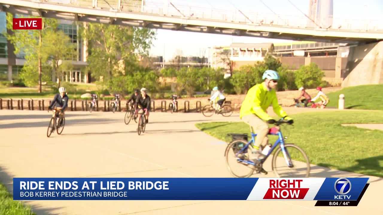 JUST A FEW MINUTES. ANNA. THANKS, CAITLIN. WELL, BIKING THROUGH THE METRO RIGHT NOW IS THE BELLEVUE BICYCLE CLUB AND IZZY VON FERRO DROOL IS LIVE AT THE STARTING LINE. GOOD MORNING IZZY. GOOD MORNING ANNA. IT IS A BEAUTIFUL MORNING DOWN HERE AT THE BOB KERREY PEDESTRIAN BRIDGE. WE HAVE BIKERS LINED UP READY TO GO. AND JOINING ME IS PRESIDENT OF THE BELLEVUE BICYCLE CLUB, MIKE MCGEE. TELL ME ABOUT THE BELLEVUE BICYCLE CLUB. WE’RE A LARGE CLUB HERE IN THE METRO AREA. WE ACTUALLY COVER OMAHA, COUNCIL BLUFFS METRO AREA. WE HAVE ABOUT 150 MEMBERS, AND WE WANT TO SEPARATE HELP CYCLING AND WORK WITH THE ADVOCACY TO SUPPORT CYCLING IN EVERY WAY POSSIBLE. THAT’S AWESOME. AND YOU GUYS ARE SUPPOSED TO START AT EIGHT, SO LET’S GET THINGS READY TO GO. WE HAVE ALL OF YOUR RIDERS LINED UP OVER HERE. WE’RE GOING TO GIVE THEM A LITTLE BIT OF A COUNTDOWN. ARE YOU READY? WE’RE READY. THREE, TWO ONE. GO. WOO! THERE THEY ALL GO. THEY WILL BE RIDING THROUGH THE METRO AREA. THEY WILL HIT LA VISTA. PAPILLION. RALSTON. SO IF YOU ARE DRIVING THIS MORNING, PLEASE BE SURE TO KEEP AN EYE OUT FOR THEM. GIVE THEM PLENTY OF ROOM ON THE ROAD AND STAY SAF