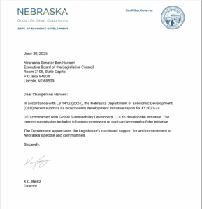 Current DED Deputy Director Joe Fox, reached Wednesday, referred questions to department spokesman Justin Pinkerman, who confirmed that the bioeconomy report “appears to have been compiled and submitted after the deadline” in state law of June 30, 2025. He said some elements included in the report had been written before the deadline, including “The Nebraska Bioeconomy Handbook” and a GSD summary of the bioeconomy initiative.