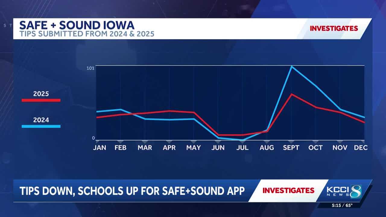 Fewer calls came to the Safe + Sound app in calendar year 2025 than in 2024.Safe and Sound is a free, statewide digital tool that allows people to report school safety tips anonymously.Safe + Sound tips in 2025 numbered 376. That compares to 426 the previous year.But the number of school districts using the app increased, says Special Agent in Charge Kyle Bassett with the Governor’s School Safety Bureau. The bureau is a part of the Iowa Department of Public Safety. There are 168 of 325 school districts using the app.”You can get in there, whether it’s parents, teachers, students, administrators, people in the community report a threat,” says Bassett, “and there will be a team of dispatchers, along with myself and another analyst who will see the threat and will respond 24/7.”KCCI Investigates got a comparison of the two full years the app has been used.One of the key drivers for the 432 tips in 2024 was a huge number of school threats in September. There were 101 tips that month.The summer month numbers dwindle to a handful or none. Then the tips increase in the fall when school resumes.The types of reports and tips from 2025 break down in the following ways:”Other” safety issues: 138Assault or harm to others: 82Reports of guns, knives or explosives: 43Drug trafficking: 31Suicide threats: 23Child abuse: 19Planned school attack: 15Sexual assault/rape: 13Terrorism: 5Bodily injury/emergency: 5Bullying/cyberbullying: 2″It seems like there has been an increase in the use of AI and swatting, not only in Iowa, but nationwide,” says Bassett.Swatting calls in fall 2025 targeted some districts and universities. The calls were hoaxes.”One of the goals of swatting is to take up resources of law enforcement, schools dispatchers,” says Bassett, “and we have to treat every one of those calls as if it’s credible until we know different.”Bassett says the next priority for the bureau: establishing behavioral threat assessment teams.This comes out of passage of Senate File 583.”It allows the communication of school professionals, counselors, law enforcement to communicate about kids in school districts that might need some help,” he says. “We’re working on putting together an Iowa-based model, to provide to the entire state that school districts can use free of charge.”Reports are investigated locally, so the Governor’s School Safety Bureau doesn’t track arrests or interventions. NAVIGATE: Home | Weather | Local News | National | Sports | Newscasts on demand |