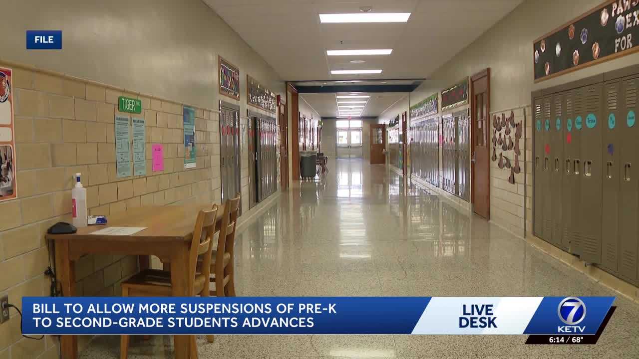 Nebraska lawmakers have advanced a bill that would expand when schools are allowed to suspend students in second grade and younger.After a bill passed in 2023, schools have only been allowed to suspend Pre-K to 2nd-grade students if they bring a weapon to school or a school vehicle. The bill’s sponsor, Sen. Dave Murman, said they have received complaints from several teachers since the original bill passed. The bill adds “violent behavior capable of causing physical harm” as an exception for when young students can be suspended.The sponsor of the original bill to ban the suspensions, Terrell McKinney, argues that schools should have been implementing alternative measures of discipline, but were not. Lincoln Sen. George Dungan supports the bill but said he understands the opposition. “We know that any suspension of young students increases the likelihood of the school-to-prison pipeline becoming a factor in their life,” Dungan said on the floor of the legislature on Tuesday morning. “And one of the things that I think everybody in this body agrees on is that we should be doing everything we can to prevent students from getting involved in the juvenile justice system and subsequently the criminal justice system as early as possible.”Dungan added an amendment to the bill that ensures written and verbal notice of the reasons for a suspension, which was adopted. The bill also encourages a meeting with parents or guardians and the school regarding the student’s behavior. Legislative Bill 653 also would make changes to the enrollment option program. The change on young student suspension options was originally introduced in a separate bill.The bill needs one more vote for final approval. Make sure you can always see the latest news, weather, sports and more from KETV NewsWatch 7 on Google Search.NAVIGATE: Home | Weather | Local News | National | Sports | Newscasts on demand |