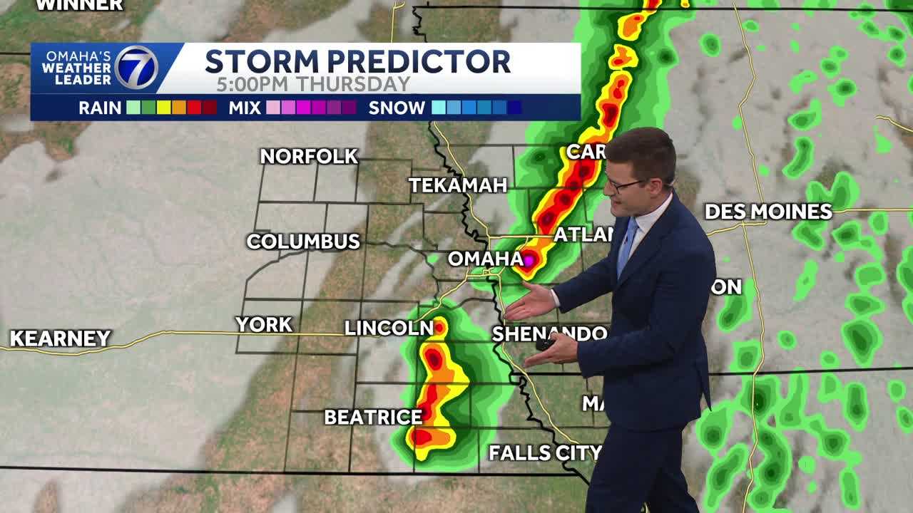 DICEY MORNING DRIVE MAY SEE A LITTLE DAMPNESS ON THE ROAD. A FEW LITTLE SHOWERS, BUT WATCHING FOR POTENTIAL STRONG TO SEVERE STORMS AS WE HEAD INTO THE AFTERNOON AND EVENING. SO AS WE’VE BEEN TALKING ABOUT THE LAST SEVERAL DAYS, THURSDAY, A SEVERE WEATHER DAY WITH AROUND SEVERE STORMS POSSIBLE. THE CHANGE THIS MORNING IS THE TIMING. LOOKING LIKE THE COLD FRONT WILL COME THROUGH A LITTLE QUICKER A LITTLE EARLIER. SO THAT WILL BRING CHANCES AFTER 2 P.M. OUR WINDOW IN THE OMAHA METRO BEST CHANCES WILL BE BETWEEN 2 AND 5 P.M. AND ALL DEPENDS ON WHERE THAT FRONT IS. IF THOSE STORMS WILL INITIATE JUST WEST OF ALL RIGHT OVER OR JUST TO THE EAST. BUT AS STORMS DEVELOP THIS AFTERNOON, ALL MODE SEVERE WEATHER IN PLAY, LARGE HAIL, 60 PLUS MILE PER HOUR WIND GUSTS AND CAN’T RULE OUT A POSSIBLE TORNADO WITH THE EARLY ONSET OF THOSE STORMS. SO STORM PREDICTION CENTER STILL HAS THAT SLIGHT RISK HERE IN YELLOW OF EASTERN NEBRASKA, SOUTHWEST IOWA AND NORTHWEST MISSOURI. AND WE’LL BE WATCHING WHERE THAT FRONT WILL END UP BY THE MIDDLE OF THE AFTERNOON. SO REALLY, THE END OF THE SCHOOL DAY, DISMISSAL TIME, THE START OF THE EVENING DRIVE, A LOT OF PEOPLE ARE GOING TO BE OUT AND ABOUT, SO HAVE TO STAY WEATHER AWARE AS WE CONTINUE THROUGH THE LATE AFTERNOON AND EVENING. AS YOU SEE HERE ON STORM PREDICTOR, HERE’S THE LATEST MODELS. IN THE MORNING WE’LL HAVE THE CLOUDS AROUND SPOTTY LIGHT SHOWERS ON AND OFF THROUGHOUT THE MORNING THROUGH THE LUNCH HOUR. NOW WATCH WHAT HAPPENS. 2:00 THIS PARTICULAR MODEL RUN. YOU SEE THE CLOUDS BREAK UP, WE GET THE SUNSHINE. WE GOT A LOT OF POTENTIAL ENERGY FOR THOSE STORMS. AND IF WE GET THAT SUNSHINE, THAT WILL ERODE THE CAP OR BASICALLY THE LID ON THE ATMOSPHERE. AND ONCE YOU LIFT THAT, THOSE STORMS CAN JUST BUBBLE UP. NOW, THIS PARTICULAR MODEL WATCH HERE THREE, 4:00 DEVELOPS THOSE STORMS NEAR AND JUST EAST OF OMAHA. THIS SCENARIO WOULD HAVE MOST OF THE METRO MISSING OUT ON THAT INITIAL DEVELOPMENT. THERE’S 5:00. NOW, SOME OF THE OTHER MODELS HAVE THAT DEVELOPING JUST A FEW MILES WEST. SO IT’S GOING TO BE A CLOSE CALL HERE IN THE OMAHA METRO. BUT IT’S REALLY THAT 2 TO 5 P.M. WINDOW BECAUSE AS WE PROGRESS INTO THE EVENING, SIX, 7:00 MORE LIKELY DEVELOPING INTO A LINE IN SOUTHWEST IOWA IN THE FAR SOUTHEAST NEBRASKA. SO AS IT MORPHS MORE INTO LINE, THAT WOULD LOWER MORE OF THE HAIL AND TORNADO THREAT AND SHIFT MORE OF A DAMAGING WIND THREAT WITH THAT LINE OF STORMS THERE. 7:00 AND EIGHT, 9:00 PUSHING OUT OF THE VIEWING AREA. SO REALLY WATCHING THAT AFTERNOON AND EARLY EVENING TIMETABLE FOR THE GREATEST CHANCES FOR ANY SEVERE ACTIVITY THIS MORNING. WE’VE GOT THE CLOUDS AROUND A LITTLE BAND OF RAIN SHOWERS FROM COLUMBUS DAVID CITY UP TOWARD WEST POINT AND THE OTTAWA AREA HEADING TOWARD THE OMAHA METRO. SO OUR DRY TIME LOOKING NUMBERED HERE THIS MORNING. CURRENTLY DRY, CLOUDY, WINDY, WARM AND HUMID, 67 DEGREES RIGHT NOW THAT SOUTH WIND 22MPH. DEW POINT 60 DEGREES. SO WE’VE GOT THE MOISTURE AVAILABLE FOR THOSE STORMS LATER ON. TEMPERATURES IN THE MID 60S TO START THE DAY. W█IND GUSTS 2025, 30MPH. SO THAT’S GOING TO KEEP UP. SO 12 HOUR FORECAST. HAVE THE RAIN JACKET HANDY. AGAIN MORE NUISANCE IMPACT WEATHER WITH SOME SCATTERED SHOWERS. TEMPERATURES DON’T BUDGE MUCH THROUGH NOON. AND THEN THERE’S OUR WINDOW OF OPPORTUNITY AFTER 2:00 THROUGH AROUND 5:00 HERE IN THE OMAHA METRO FOR THE POTENTIAL FOR SEVERE WEATHER. AND THEN BEHIND THE SYSTEM, WE QUIET DOWN SUNSHINE BACK ON FRIDAY AND THEN AN UNSETTLED WEEKEND WITH SCATTERED SHOWERS POSSIBLE SATURDAY AND POSSIBLY ANOTHER ROUND OF SHOWERS AND STORMS MORE WIDESPREAD ON SUNDAY AND INTO MONDAY. BUT WITH THE THREAT OF SEVERE WEATHER LATER T