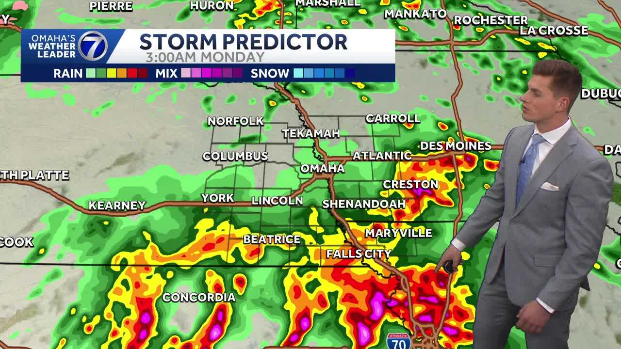 METEOROLOGIST LUKE VICKERY. WITH THE ACCURATE FORECAST, YOU CAN TRUST. WELL GET READY FOR SOME RAIN TONIGHT. IT SEEMS LIKELY, ESPECIALLY FOR THE OMAHA AREA AND SOUTHWARD. SO HERE’S THE STORM PREDICTION CENTER RISK. THIS IS THE SEVERE RISK. AND THEY PUT THIS MAP OUT KIND OF GENERICALLY FOR SUNDAY 7 A.M. ALL THE WAY TO MONDAY MORNING AT 7 A.M. SO THIS DOES INCLUDE THE OVERNIGHT HOURS. AND WHAT WAS OUR AFTERNOON ROUND OF STORMS. BUT REALLY FOR ME, THIS LEVEL TWO OUT OF FIVE YELLOW SHADE THAT SHOULD BE SHRUNK A LITTLE BIT FURTHER SOUTH, I’D SAY OMAHA, SOUTH OF THE I-80 CORRIDOR. THE BETTER CHANCE TO SEE A STRONGER THUNDERSTORM AND REALLY THE STRONGEST THUNDERSTORMS ARE GOING TO BE SOUTH OF OUR VIEWING AREA. BUT, I MEAN, IF A STORM GETS GOING, I THINK THE MAIN RISK MAY BE SOME HAIL UP TO AN INCH AND A HALF. I THINK THAT’S EVEN PUSHING IT. AND I THINK A BIGGER RISK THAN THAT WILL ACTUALLY BE FAT. EXCUSE ME. FLASH FLOODING FOR THE SOUTH SIDE OF OUR VIEWING AREA. AND THAT’S WHY THE NATIONAL WEATHER SERVICE HAS THE GREEN SHADE IN THOSE COUNTIES. THAT’S A FLASH FLOOD. WATCH OUT FOR SOUTHEAST NEBRASKA, SOUTHWEST IOWA IN AREAS OF NORTHWEST MISSOURI MONDAY, THE SEVERE WEATHER RISK SHIFTS EAST. THIS IS A VERY GENERIC MARGINAL RISK ONE OUT OF FIVE LEVEL. SO WE’RE NOT EXPECTING MUCH IN TERMS OF SEVERE WEATHER, ESPECIALLY FOR TOMORROW. AND EVEN FOR TONIGHT. IT LOOKS LIKE IT’S ON THE LOWER SIDE. THERE’S LVIV DEUEL PAUL. WE’RE IN A LULL PERIOD RIGHT NOW. NOT A LOT TO SPEAK OF. YOU LOOK OUT WEST NEAR YORK. MAYBE SOME SHOWERS TRYING TO CREEP THEIR WAY IN. OUR ACTION FOR TONIGHT IS STILL IN CENTRAL KANSAS, KIND OF NEAR HAYES, AND THAT WILL EVENTUALLY DRIFT UP IN OUR DIRECTION AND CAUSE SOME SHOWERS AND RUMBLES OF THUNDER. SO AGAIN, IT’S STILL A WAYS OFF, BUT I’D SAY ONCE WE GET TO MIDNIGHT 1 A.M., YOU’LL HAVE SOME SHOWERS AND EVEN SOME RUMBLES OF THUNDER. HERE’S MIDNIGHT. YOU CAN SEE SHOWERS AND THUNDERSTORMS SPREADING INTO THE AREA, MOSTLY SOUTH OF OMAHA. BY THAT POINT, INCREASING IN COVERAGE BY 3 A.M. AND NOTICE THE MAGENTA SHADES ALL SOUTH OF US CONCORDIA, KANSAS, AND EVEN CLOSER TO TOPEKA, KANSAS. I THINK THAT’S WHERE THE STRONGER THUNDERSTORMS WILL BE. SO WE MIGHT NOT GET ANY SEVERE THUNDERSTORMS FOR TONIGHT. IT’S POSSIBLE FOR US BETTER INGREDIENTS. SO AGAIN, IN KANSAS RATHER THAN HERE THERE. 6 A.M. SO IF YOUR MORNING DRIVE STARTS EARLY, BE READY FOR SOME SHOWERS AND RUMBLES OF THUNDER THAT WILL ZIP ON BY BY 8 A.M. I THINK WE’RE RELATIVELY QUIET OUTSIDE OF MAYBE SOME SCATTERED SHOWERS THROUGH 10 A.M. YOU CAN’T RULE OUT SOME SCATTERED SHOWERS MOVING THROUGH THE AREA. A COLD FRONT WILL MOVE THROUGH. WE’LL ACTUALLY SEE TEMPERATURES PROBABLY IN THE MID 50S DURING THE AFTERNOON. SO A CHILLIER DAY TOMORROW AND A CLOUDY DAY FOR YOUR MONDAY. THERE’S A LIVE LOOK OUTSIDE. THIS IS OUR CHARLES SCHWAB SKYCAM. THINGS ARE CALM AND QUIET RIGHT NOW. AGAIN, NO RAIN YET. WE’RE AT 63 DEGREES. THE SOUTHEAST WIND AT JUST NINE MILES PER HOUR AND THE CLOUDS ARE INCREASING AHEAD OF THE SHOWERS AND THUNDERSTORMS THAT WE’LL SEE OVERNIGHT. SO 11 P.M. I DON’T THINK YOU SEE MUCH. 2 A.M. WE’RE TALKING SHOWERS AND RUMBLES OF THUNDER, ESPECIALLY SOUTH OF OMAHA. THAT WILL LAST THROUGH ABOUT 6 A.M., POTENTIALLY A LITTLE 8 A.M. AND THEN A LOW CHANCE OF A SHOWER OR RUMBLE OF THUNDER AS WE GET INTO THE LATE MORNING AND EARLY AFTERNOON FOR TOMORROW. SO MONDAY IMPACT WEATHER DAY, WE’RE SEEING A 30% CHANCE YOU RUN INTO ONE OF THOSE SCATTERED SHOWERS DURING THE DAY TUESDAY. IT’S KIND OF A SAME THING. 30% CHANCE YOU RUN INTO A SCATTERED SHOWER DURING THE MIDDLE PARTS OF THE DAY. MONDAY WILL BE A CHILLY. TEMPERATURES BEGIN TO FALL. IT WILL ALSO BE KIND OF BREEZY TO WINDY OUTSIDE. SO IF YOU HAVE TO PICK TWO DAYS BETWEEN OUR TWO IMPACT WEATHER DAYS, I THINK TUESDAY IS GOING TO BE AN EASIER DAY TO BE OUTSIDE WITH VERY SIMILAR CLOUDS AROUND AND A LOW CHANCE OF A SHOWER BY WEDNESDAY. TEMPERATURES ARE IN THE 60S. THAT LASTS THROUGH FRIDAY, SATURDAY, AND SUNDAY. THOSE ARE TWO GOOD LOOKING DAYS TO BE OUTSIDE, SO IF YO
