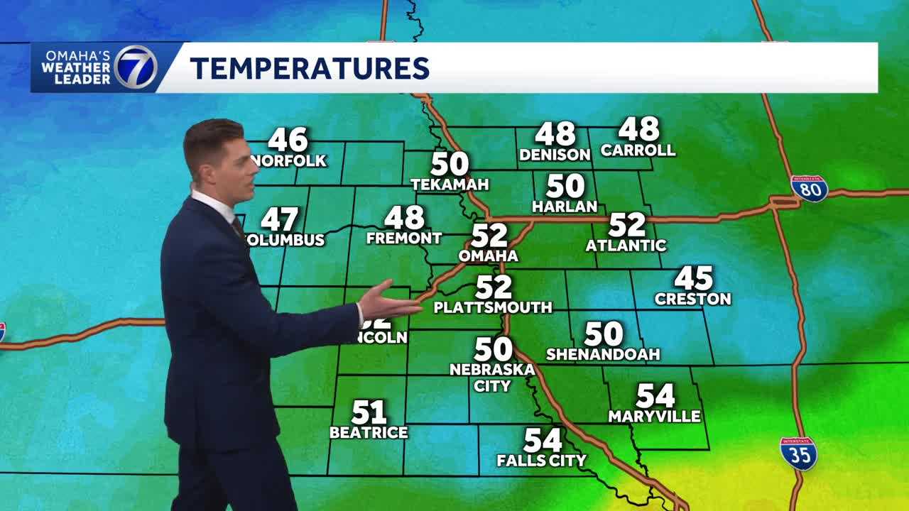 YESTERDAY. QUANECIA. BUT HEY, IT’S STILL NICE. WE’LL GET TEMPERATURES HOPEFULLY INTO THE LOWER 60S THIS AFTERNOON. THERE IS A CHANCE A COUPLE STORMS MAY FORM NORTHWEST MISSOURI TONIGHT. I DON’T SEE OMAHA AND A RISK OF STORMS OR ANYTHING LIKE THAT, BUT THE FAR SOUTHEAST SIDE OF OUR VIEWING AREA. IT’S POSSIBLE YOU GET A COUPLE RUMBLES OF THUNDER FOR OMAHA, THOUGH. A LIGHT MIXED PRECIPITATION COULD HAPPEN EARLY WEDNESDAY MORNING. THIS COULD BE DURING THE MORNING DRIVE TIME. IT COULD BE VERY LIGHT RAIN, OR IT COULD BE SOME VERY LIGHT SNOWFLAKES MIXING IN THERE. WHATEVER WE GET, IT’D BE LIGHT PRECIPITATION AND THEN WE’RE WINDY AND MILD AGAIN ON THURSDAY AS TEMPERATURES GO BACK INTO THE MID 60S FOR THAT STORM CHANCE, I THINK IT’S MOSTLY NORTHWEST MISSOURI AREAS FURTHER SOUTH NEAR KANSAS CITY, GETTING CLOSER TO SAINT LOUIS, AND AREAS NORTH OVER THERE TOWARDS ILLINOIS. THAT’S THE REAL STORM RISK. THERE IS A CHANCE MAYBE YOU COULD GET PEA SIZED HAIL OR A COUPLE RUMBLES OF THUNDER TONIGHT IN THAT AREA. SO LET’S TALK ABOUT IT HERE. THERE’S TUESDAY. THAT’S THE DAY AT 430. A MIX OF SUN AND CLOUDS, TEMPERATURES LIKELY TO LOWER 60S. 10:00 THE SKIES CLEAR OUT. YOU STILL DON’T SEE ANY STORMS. THAT’S BECAUSE THEY’RE DOWN FAR WAY SOUTH NEAR KANSAS CITY. THAT’S WHERE THEY FORM. AND THEN MAYBE A COUPLE DRIFT UP FURTHER NORTH. FALLS CITY MARYVILLE. IN THE MIDDLE OF THE NIGHT, YOU COULD GET A RUMBLE OF THUNDER. SOMETHING LIKE THAT. AGAIN FOR OMAHA. THERE IS A CHANCE OF MAYBE THE LIGHT RAIN OR LIGHT SNOW. NOTICE THE TEMPERATURES IN OMAHA AT 4:00, 5:00, 6 A.M. 7 A.M. DURING THAT MORNING DRIVE TIME, THEY SHOULD STAY ABOVE FREEZING. SO IF WE DO SEE ANY SNOWFLAKES MIX IN, WE’RE NOT REALLY WORRIED ABOUT ACCUMULATION IN OMAHA. AND IT MAY JUST BE LIGHT RAIN AND WET PAVEMENT. THAT’S REALLY GOING TO BE THE BIGGER IMPACT THAT SHOULD MOVE OUT. BY 8 A.M. TEMPERATURES WILL BE IN THE MID 30S, STILL ABOVE FREEZING ABOUT THAT TIME. AND WE’LL SEE DECREASING CLOUD COVER THROUGH THE DAY TOMORROW. IN TERMS OF THAT SNOW ACCUMULATION. AGAIN, SUPER LIGHT. AND I THINK IF WE SEE ANY SNOW ACCUMULATE, MAYBE A DUSTING ON THE GRASSY SURFACES. AND THAT WOULD BE WELL NORTH OF OMAHA. NORFOLK TEKAMAH AREAS LIKE THAT LIVE. LOOK OUTSIDE. WE HAVE THE BLUE SKIES. IT LOOKS NICE OUTSIDE. NOT QUITE AS NICE AS YESTERDAY THOUGH. WE’RE AT 52 DEGREES. A LIGHT EAST NORTHEAST BREEZE AT TEN MILES PER HOUR. SO A LITTLE BREEZIER. A LITTLE MORE CLOUD COVER AND A LITTLE COOLER IN COMPARISON TO YESTERDAY. 52 PLATTSMOUTH, 54 HARLAN 50 TEKAMAH 46 DEGREES UP IN NORFOLK. WE HAVE NOTHING ON LIVE SUPER DOPPLER RADAR. WE DON’T EXPECT TO SEE ANYTHING ON THERE, AT LEAST FOR THIS EVENING AND MAYBE LATE TONIGHT. WE’LL WATCH IN NORTHWEST MISSOURI. AND THEN FOR THE EARLY MORNING HOURS, WE’LL WATCH THAT LIGHT RAIN OR SNOW COME IN FOR WEDNESDAY MORNING. THERE’S A LOT OF CLOUDS NORTH AND WEST OF OMAHA, BUT NONE FOR US. YOUR HOUR BY HOUR FORECAST JUST FOR THIS AFTERNOON INTO THE EVENING. WE’LL KEEP TEMPERATURES 50, MAYBE LOWER, 60 FOR THE HIGH TEMPERATURE, AND THEN WE’LL DROP BACK LATER ON THIS EVENING INTO THE 40S AND EVENTUALLY THE 30S OVERNIGHT. SO WE HAVE 34. IS THE LOW TEMPERATURE AGAIN THAT LIGHT CHANCE OF RAIN OR MAYBE SOME MIXED PRECIPITATION IN THERE FOR THE EARLY MORNING HOURS. AND THEN WE SEE A LITTLE BIT MORE SUN IN THE AFTERNOON WITH HIGH TEMPERATURES GETTING AROUND THE 50 DEGREE MARK. SO THAT’S REALLY CLOSER TO A NORMAL HIGH TEMPERATURE THIS TIME OF YEAR, WHICH WE’LL HAVE ON WEDNESDAY. THURSDAY WE SHOOT RIGHT BACK UP INTO THE MID 60S. 66 IS OUR FORECASTED HIGH. IT WILL BE A LITTLE WINDY THAT DAY, SO MAYBE IF WE DON’T GET A LOT OF MOISTURE HERE ON WEDNESDAY MORNING, THAT COULD LEAD TO POSSIBLY SOME FIRE DANGER CONCERN ON THURSDAY BECAUSE IT’S GOING TO BE DRIER OUTSIDE AND WINDY FRIDAY DOWN TO 51 AGAIN. SO KIND OF THIS LITTLE TEETER TOTTER RIDE WITH TEMPERATURES HERE. QUANECIA. I JUST WISH WE HAD THE NIC