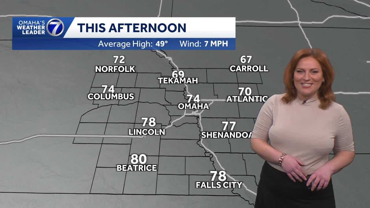REENA ROY, ABC NEWS, NEW YORK. NOW FROM OMAHA’S WEATHER LEADER, METEOROLOGIST CAITLIN HARVEY. WITH THE ACCURATE FORECAST, YOU CAN TRUST. 1214. NOW ON YOUR MONDAY AFTERNOON AND THIS IS SOME PATIO WEATHER IF WE’VE EVER SEEN IT. BRIGHT BLUE SKIES HERE FROM OUR CAMERA AT 72ND IN CROWN POINT, LOOKING EAST TOWARD THE CITY. GO AHEAD, GET OUT TODAY IF YOU CAN. 64 RIGHT NOW IN OMAHA, WINDS BECOMING LIGHT FOR MANY OF US. A LITTLE BIT BREEZY AT TIMES, THOUGH. OUT OF THE NORTHEAST. UP TO 14 MILES AN HOUR. NORFOLK. 66 AT 66 AS WELL IN MARYVILLE AND WARMER, 68 OUT IN LINCOLN. LIVE SUPER DOPPLER WITH OUR THREE MINUTE ADVANTAGE STILL SHOWING THOSE CLEAR SKIES. EASTERN NEBRASKA, WESTERN IOWA, NORTHWEST MISSOURI. AND WE’RE GOING TO KEEP IT THAT WAY HERE THIS AFTERNOON. OUR AVERAGE HIGH 49. LET’S SHOOT WELL ABOVE THAT 74 OMAHA. 80 TODAY. THE ANSWERS ARE FORECAST HIGH 70 ATLANTIC AND 74 FOR FOLKS IN COLUMBUS FORECAST FOR TONIGHT. WE’LL KEEP OUR SKIES MOSTLY CLEAR. AND THOSE MILD TEMPERATURES WITH US ONLY DROPPING DOWN TO ABOUT 43 WHICH AGAIN PRETTY NICE HERE FOR THIS TIME OF YEAR. WINDS REMAINING PRETTY LIGHT THOUGH. THOSE ARE GOING TO PICK UP AS WE HEAD INTO YOUR TUESDAY. OUR LATEST STORM PREDICTOR MODEL THROUGHOUT THE REST OF THE DAY TODAY. STILL LOOKING FAIRLY QUIET AS WE WORK OUR WAY INTO OUR OVERNIGHT HOURS. STARTING OFF TOMORROW. MOSTLY CLEAR, BUT CLOUDS GOING TO INCREASE THROUGHOUT THE DAY. TUESDAY SEEING A SLIGHT CHANCE FOR A FEW SHOWERS OVERNIGHT AND INTO EARLY WEDNESDAY MORNING. BUT TRULY, WE DO HAVE SOME DRY AIR TO COMBAT ANY RAIN THAT DEVELOPS, AND I THINK THIS WILL STAY A BIT FURTHER SOUTH FOR SOUTHEAST NEBRASKA, NORTHWEST MISSOURI SOUTH CENTRAL IOWA COULD SEE AN ISOLATED, STRONG TO SEVERE STORM TUESDAY NIGHT. BUT AGAIN, I THINK THAT GOING TO STAY MORE INTO MISSOURI SEVEN DAY FORECAST. NOT TOO BAD. 74 YOUR HIGH TODAY 20% CHANCE FOR THOSE SHOWERS LATE TUESDAY. UP TO 30% BY THOSE OVERNIGHT HOURS BY WEDNESDAY. COOLER RELATIVELY SPEAKING A HIGH OF 51 BACK UP TO THE MID 60S. WINDY THURSDAY WITH ELEVATED FIRE DANGER. SO WE’LL JUST HAVE TO BE A LITTLE EXTRA CAUTIOUS. SAMANTHA RIGHT. BUT TODAY YOU’RE BRINGING EVERYBODY THE BEST NEWS EVER. WE’RE IN TOP TEN DAY POTENTIALLY GET OUTSIDE. WHETHER THIS IS LIKE PATIO WEATHER ADVISORY 74 SUNNY YEAH. PATIO WHETHER WARNING LIGHT