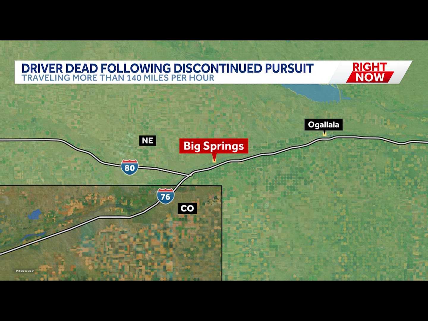 A suspect is dead after driving away from state troopers at more than 140 miles per hour in western Nebraska.The crash happened in Big Springs, which is west of Ogallala, just after midnight Monday. Officials said a trooper pursued the vehicle for about five minutes before discontinuing the pursuit as the vehicle exited Interstate 80 and appeared headed into Colorado on Interstate 76.The Nebraska State Patrol said the driver crashed near the Colorado border and was ejected from the car.The name of the driver has not been released.Make sure you can always see the latest news, weather, sports and more from KETV NewsWatch 7 on Google search.NAVIGATE: Home | Weather | Local News | National | Sports | Newscasts on demand |