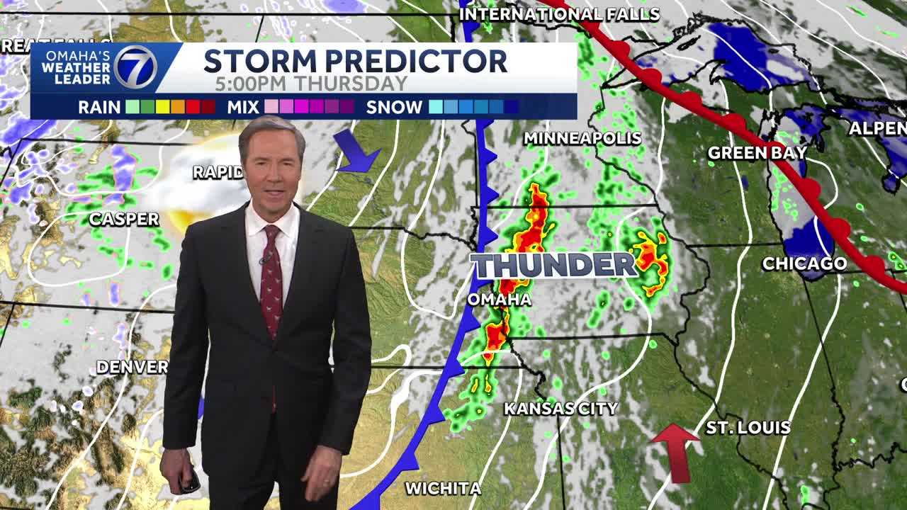 SO YOU CAN’T MAKE EVERYBODY HAPPY. BIG MONEY INVOLVED THERE? YEAH, FOR SURE. AND I’M HOPING TO GET IT ALL SETTLED AND EVERYTHING. WE’VE GOT A CHANCE OF THUNDERSTORMS TOMORROW AFTERNOON. AND THAT’S KIND OF THE FOCUS OF THE WEATHER FORECAST HERE. FACTOR TIME. IT WILL BE A FOR THURSDAY. UNPLEASANT FOR BEING AND WORKING OUTSIDE THE RISK OF SEVERE THUNDERSTORMS IN THE AFTERNOON AND EARLY EVENING, MAYBE DAMAGING WINDS, MAYBE SOME LARGE HAIL. CAN’T RULE OUT AN ISOLATED TORNADO, BUT WHEN. BUT WHERE? WELL, HERE’S OUR LATEST COMPUTER MODEL. THIS IS THE HIGH RESOLUTION RAPID REFRESH. THERE’S LUNCHTIME SHOWING SPOTTY SHOWERS, BUT A LITTLE CLEARING. THERE IS 2:00 IN ISOLATED STORM IN SAUNDERS COUNTY. 3:00 MAYBE UP TOWARD THE OMAHA METRO HERE. THIS IS A BRAND NEW RUN OF THE HIGH RESOLUTION RAPID REFRESH. AND AT 4:00 IT’S GOT IT JUST PAST OMAHA 5:00, A BIG STORM AROUND NEBRASKA CITY, 6:00 WESTERN IOWA, 7:00. SO THAT REALLY LIMITS STUFF FOR THE OMAHA AREA. THIS IS THE OTHER COMPUTER MODEL. WE USE THE GRAPH. THIS ONE ALSO NEW SINCE 6:00, SHOWS YOU 2:00 SOME RAIN AND THUNDER JUST WEST OF FREMONT MOVING UP MAYBE TOWARD TEKAMAH 3:00 AND THEN CLOSER TO THE OMAHA METRO BY 4:00. BY 5:00 ACROSS THE RIVER INTO WESTERN IOWA. THE LEADING EDGE IS REALLY WHERE YOU’RE GOING TO FIND THE MOST SEVERE CONDITIONS. WIND AND 6:00 ALREADY APPROACHING ATLANTIC AND OUT OF THE OMAHA METRO. AND THEN SEVEN 8:00 INTO THE DES MOINES AREA. SO IF THAT SECOND ONE VERIFIES, THAT WOULD BE MAYBE HALF TO TWO THIRDS OF AN INCH. ALTHOUGH IF YOU GOT UNDER A COUPLE THUNDERSTORMS, YOU COULD GET HEAVIER RAINFALL THAN THAT PRETTY FAST MOVEMENT. SO NOT FLOODING RAINFALL, BUT BENEFICIAL RAINFALL NONETHELESS. 82 AND 61 TODAY, NO MOISTURE TODAY. AND WHILE WE’RE ABOVE AVERAGE FOR THE MONTH, IT’S BEEN DRY LATELY AND WE NEED SOME MOISTURE WITH THE METHODIST WOMEN’S HOSPITAL IN WEST OMAHA STILL 69, WITH A STRONG SOUTH WIND BLOWING. AND WE ANTICIPATE THAT BREEZE TO STAY WITH US OVERNIGHT. SO TEMPERATURES ARE NOT GOING TO FALL MUCH MORE THAN THEY ARE RIGHT NOW. MAYBE DOWN IN THE MID 60S. DEUEL PAUL SUPER DOPPLER SEVEN RADAR. IT’S QUIET CLOUDS INCREASING. A COUPLE OF STORMS UP HERE IN SOUTH DAKOTA NEAR THAT FRONT. SO IT’S ALL ABOUT WHERE THAT FRONT’S GOING TO BE TOMORROW. THERE’S 8 A.M. YOU SEE THE DRIZZLE, THERE IS 5:00 IN THE AFTERNOON. THE FRONT IN THE VICINITY, AND THAT’S WHEN WE HAVE OUR STORM CHANCE TONIGHT. A LOW TEMPERATURE OF 63. MOSTLY CLOUDY. COULD GET SOME DRIZZLE OR VERY LIGHT SHOWERS LATE TONIGHT INTO TOMORROW MORNING. SO IMPACT WEATHER COULD BE WET FOR THE MORNING DRIVE. PROBABLY SCATTERED SHOWERS MIDDAY. AND THEN THE 70% CHANCE OF THUNDERSTORMS 4:00 ISH OUT PRETTY QUICKLY DURING THE EVENING. AND THERE GOES OUR IMPACT OR SEVERE WEATHER. AND IT LOOKS LIKE QUIETER FOR FRIDAY WITH SOME SUNSHINE. SATURDAY CLOUDS MOVE BACK IN. COULD SEE A SPOTTY SHOWER SATURDAY, BUT SUNDAY AND MONDAY IMPACT WEATHER WITH MORE RAIN CHANCES AND COULD BE SOME THUNDER IN THERE ON SUNDAY. MAYBE EVEN AN OVERNIGHT STORM CHANCE. WE’LL HAVE TO WATCH AND SEE ABOUT SEVERE POSSIBILITIES THERE. APRIL SHOWERS. YEAH YOU’RE RIGHT. THANKS.