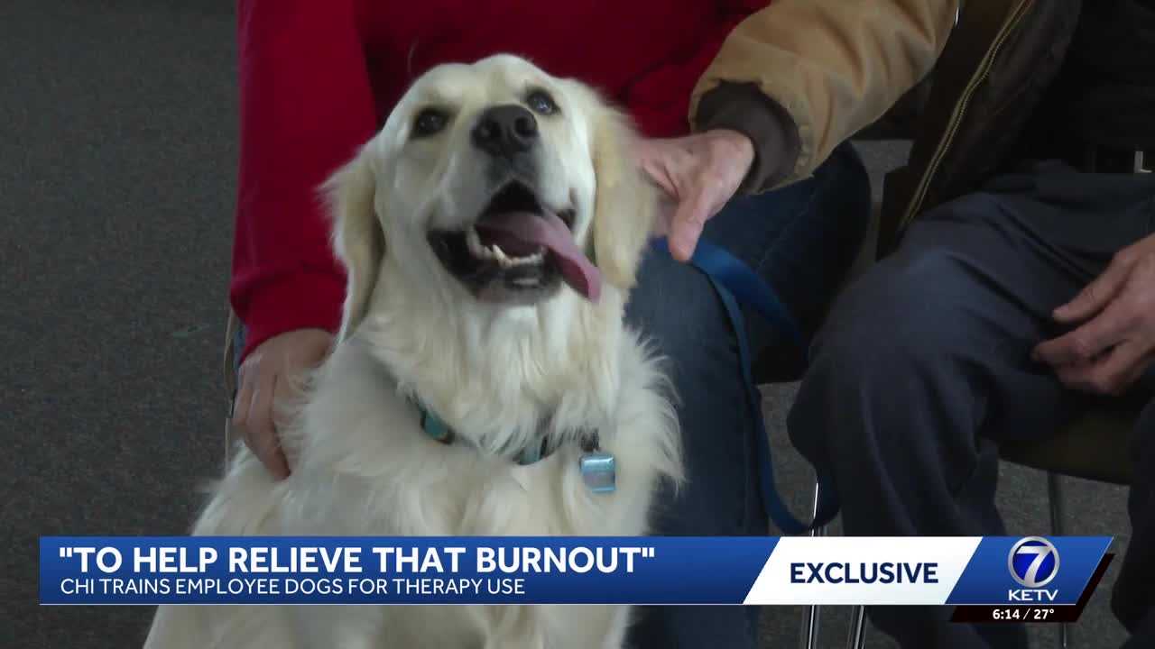 WRAPPING UP. LUKE WILL BE BACK WITH YOUR FULL FORECAST IN JUST A FEW MOMENTS. THERAPY DOGS ARE COMMONLY SEEN COMFORTING PATIENTS IN HOSPITALS, HELPING THEM FEEL MORE AT EASE AS THEY WORK THROUGH AN ILLNESS. NOW, CHI HEALTH IS SHOWING THAT THEY CAN HELP MORE THAN JUST THE PATIENTS. KETV NEWSWATCH SEVEN’S MARY REGLI SHOWS US HOW IN THIS KETV EXCLUSIVE. WORKING IN HEALTHCARE CAN BE STRESSFUL TO SAY THE LEAST. THEY’RE THE ONES THAT ARE FIRST RESPONDERS. THEY’RE THE ONES THAT TAKE PATIENTS IN THAT, YOU KNOW THEIR MOST VULNERABLE TIMES, AND THEY’VE GOT TO TAKE ALL THAT STRESS FROM THAT PATIENT, THEIR FAMILIES, GUEST SERVICES VOLUNTEERS AT CHI HAVE FOUND A CUDDLY WAY TO MITIGATE THAT STRESS. THEY COULD BE HAVING THE WORST DAY, AND AS SOON AS THEY SEE ONE OF OUR PET THERAPY DOGS, THEY SAID THAT IT TOTALLY HELPS THEIR IMPROVE THEIR DAY IN THEIR OUTLOOK, WHICH THEN REFLECTS ON THEIR THEIR PATIENTS. NOW, A NEW GRANT FROM THE BARREL INSTITUTE HAS MADE IT EVEN EASIER TO HAVE FURRY FRIENDS IN THE HOSPITAL. CHI WAS ONE OF THREE HOSPITALS IN THE WORLD SELECTED FOR THE GRANT. THERE WAS ONE IN SAN DIEGO, ONE IN BARCELONA, SPAIN, AND THEN HERE IN OMAHA, NEBRASKA. THE GRANT ALLOWS CHI EMPLOYEES AND VOLUNTEERS TO BRING THEIR DOGS TO WORK FOR A FIVE WEEK TRAINING SESSION. THE TRAINING HELPS GET THE DOGS ACCLIMATED TO A HOSPITAL SETTING. THERE’S LOTS OF BEEPING, LOTS OF DIFFERENT EQUIPMENT, THINGS THAT ARE ROLLING, THINGS THAT ARE BIG AND KIND OF TOWERING OVER THE DOGS. AND SO THERE’S A LOT OF DIFFERENT THINGS FOR THEM TO GET USED TO. NURSE JOYCE MILLER ANDERSON HAS EXPERIENCED THE BENEFITS OF THERAPY DOGS IN THE WORKPLACE AND HOPES HER DOG, PEACHES, CAN HELP MORALE, TOO. SHE JUST LOVES TO BE AROUND PEOPLE, SO WE’RE GOING TO SEE WHETHER OR NOT THIS IS GOING TO BE A GOOD FIT. CHI STAFF SAYS THEIR PROGRAM HAS NOW BECOME A BLUEPRINT FOR OTHER HOSPITALS, BUT ULTIMATELY IT COMES DOWN TO HELPING THE COMMUNITY. IF WE CAN PROVIDE A DOG JUST TO HELP RELIEVE THAT BURNOUT, I MEAN, IT’LL HELP OUR STAFF BE ABLE TO STAY LONGER IN THEIR