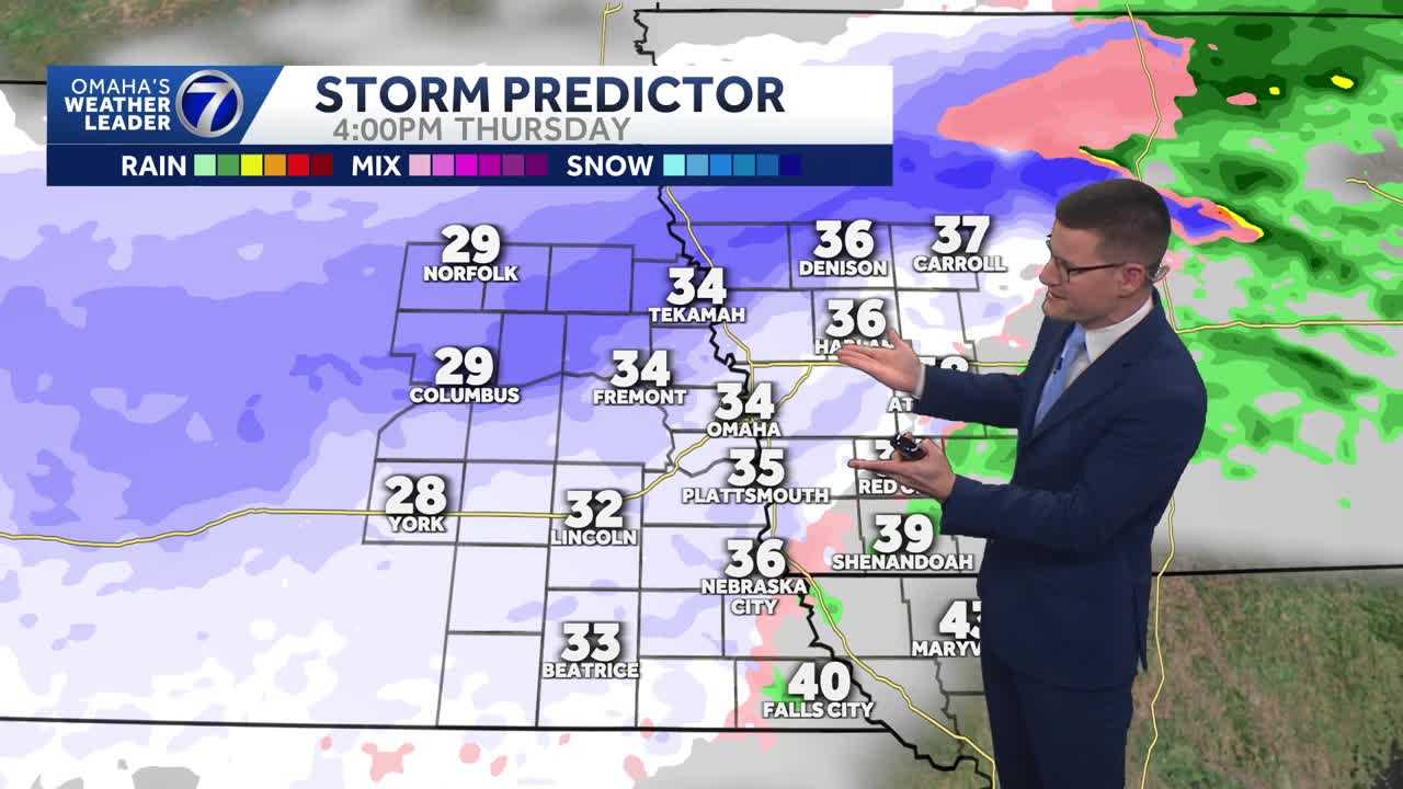 AND MOST OF THOSE DAYS IT’S BEEN IN THE 60S AND A FEW DAYS IN THE 70S. BUT GET READY. WINTER WILL RETURN. WE’VE GOT IMPACT WEATHER FOR THURSDAY INTO THURSDAY NIGHT, WITH A ROUND OF SNOW LIKELY AS WE HEAD THROUGH THE AFTERNOON AND EVENING. SO HERE’S THE THINKING RIGHT NOW. THURSDAY AFTERNOON SNOW CHANCES WILL CONTINUE TO INCREASE AS WE HEAD THREE, FOUR, FIVE, 6:00 INTO THE EVENING. THE BIGGEST QUESTION RIGHT NOW IS WHERE THE HEAVY SNOW BAND WILL LINE UP, AND THAT WILL DICTATE HOW MUCH WE’LL SEE AND THE AMOUNT OF IMPACT WE’LL SEE, ESPECIALLY ON THE ROADWAYS FOR THE EVENING COMMUTE. SO RIGHT NOW, FORECASTING THE OMAHA METRO BETWEEN 1 AND 3IN WITH THAT HEAVIER BAND AND HIGHER AMOUNTS JUST OFF TO THE NORTH. SO HERE’S THAT LATEST SNOW FORECAST 3 TO 6IN REALLY AROUND DAVID CITY BLAIR UP TOWARD CARROLL INTO THE NORTH, INCLUDING TEKAMAH NORFOLK AREA, 1 TO 3IN AROUND THE I-80 CORRIDOR, AND THEN A LOT LESS DOWN SOUTH. SO THAT’S WHERE WE’RE THINKING RIGHT NOW. BUT WHAT WE’LL BE WATCHING OVER THE NEXT 24 HOURS IS IF WE SEE A SHIFT WHERE THAT HEAVY SNOW BAND LINES UP, BUT JUST PLAN FOR IMPACTS FOR THE EVENING DRIVE ON THURSDAY. TODAY WE’LL SEE THE IMPACTS AGAIN OF DRY, BREEZY AND WARM CONDITIONS TODAY. THAT RED FLAG WARNING JUST NORTH AND EAST OF THE OMAHA METRO. MOST OF SOUTHWEST IOWA INTO NORTHEAST NEBRASKA. SO CONTINUE TO AVOID ANY TYPE OF BURNING. WITH THAT HEIGHTENED FIRE DANGER, YOU CAN SEE THE BREEZE BLOWING FROM THE FLAG THERE ON THE RIVERFRONT FROM OUR EMBASSY SUITES OLD MARKET SKYCAM 50 DEGREES. ANOTHER INCREDIBLY MILD MORNING WEST BREEZE RIGHT NOW BETWEEN 15 AND 20MPH. LOOK AT THESE TEMPERATURES OUT THE DOOR, MOST IN THE MID TO UPPER 40S HOLDING ON TO 50 IN OMAHA AND DOWN IN FALLS CITY. THAT WEST WIND. RIGHT NOW MOST SPOTS 15 TO 20MPH. WE’LL SEE THOSE GUSTS 20 TO 30 MOST OF THE DAY AND THEN CALMING AS WE HEAD INTO THE EVENING. SO ENJOY ONE MORE SPRING LIKE DAY HERE ON THE 12 HOUR FORECAST. GOOD DAY TO HAVE THE WINDBREAKER. PLENTY OF SUNSHINE, 40 IN THE MORNING. WE’LL SPEND MOST OF THE AFTERNOON IN THE LOW TO MID 60S, WITH A FEW MORE CLOUDS MOVING IN, BUT AGAIN, OUR LAST DAY FOR A WHILE WE’LL SEE TEMPERATURES THIS WARM, MAINLY CLEAR SKIES RIGHT NOW. AGAIN, WE’LL SEE AMPLE SUNSHINE FOR MOST OF THE DAY. THERE’S THE SYSTEM THAT BROUGHT ALL THE WIND YESTERDAY. SEE RAIN AND SNOW UP INTO THE DAKOTAS, NORTHERN MINNESOTA, OUR NEXT WEATHER MAKER, MOVING INTO THE WEST COAST. SO STILL, A WHILE BEFORE WE SEE ANY PRECIPITATION. SO LET’S WALK THROUGH LATEST STORM PREDICTOR SUNSHINE TODAY BY NOON MID TO UPPER 50S A FEW MORE AFTERNOON CLOUDS. HIGHS LOW TO MID 60S FOR MOST BY AROUND 4:00. NOW OVERNIGHT CLOUDS WILL INCREASE. THIS PARTICULAR MODEL SHOWING A LOT MORE RAIN AND LIGHT SNOW. NOW I THINK DRY AIR WINS OUT IN THE MORNING, SO THE MORNING DRIVE, EVEN THOUGH THIS IS SHOWING A LITTLE BIT OF PRECIPITATION, I THINK WE ARE MAINLY DRY. AND WHAT WE’LL WATCH AS WE HEAD TOWARD THE MIDDLE OF THE DAY, LIKELY SEEING SNOW REALLY DEVELOP NORTH OF I-80. STARTING IN THE OMAHA METRO AND THEN PICKING UP AS WE HEAD INTO THE AFTERNOON. AND THIS MODEL SHOWING THAT HEAVIER SNOW BAND LINING UP WHERE WE HAVE THAT 3 TO 6 INCH FORECAST RIGHT NOW. SO PLAN FOR SNOW FALLING DURING THE EVENING DRIVE, EVEN THOUGH TEMPERATURES MAY BE A LITTLE ABOVE FREEZING, THE AMOUNT OF SNOW COMING DOWN COULD OVERCOME THAT, SO STILL COULD HAVE SOME SLICK ROADS THROUGH THE EVENING DRIVE. SIX 7:00, CONTINUING THROUGH AROUND MIDNIGHT BEFORE THINGS START TO TAPER OFF. SO PLAN FOR INCREASING CHANCES TO SEE THAT SNOW AS WE HEAD LATER IN THE DAY THURSDAY, AND THEN THE COLD SETTLING IN. AS YOU CAN SEE, LOWS IN THE TEENS. HIGH