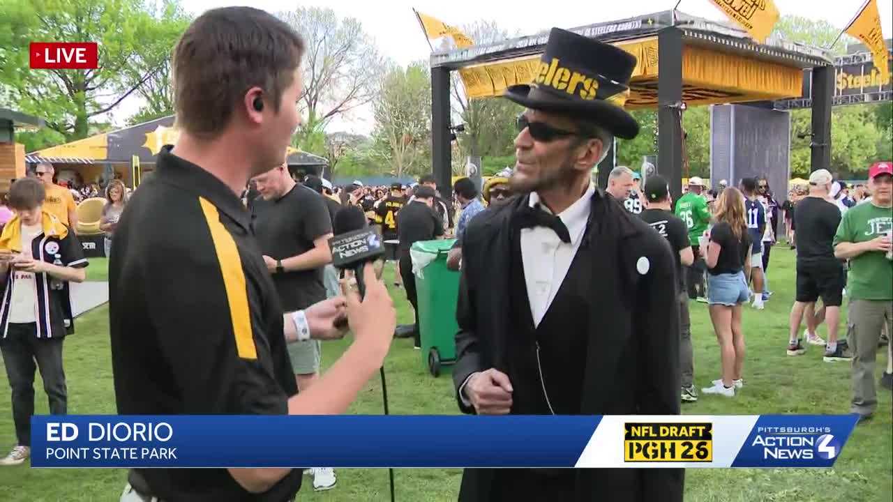 ACROSS THE COUNTRY AND THE GLOBE. WE EVEN GOT PEOPLE FROM BACK IN TIME. I GOT A LINCOLN HERE AND HE’S A STEELERS FAN. APPARENTLY. HONEST. DAVE, THANKS FOR TAKING A MINUTE. WHAT BRINGS YOU TO THE NFL DRAFT? WELL, I AM AS YOU SEE A BIG STEELERS FAN BECAUSE I LOOKED AT PITTSBURGH AS THE PARADIGM OF THE AMERICAN EXPERIMENT. I MADE MY LONGEST SPEECH ON THE WAY TO THE WHITE HOUSE RIGHT HERE. AND AFTER 1856, I DIDN’T WIN A SINGLE ELECTION IN ILLINOIS, BUT I CRUSHED IT HERE IN PITTSBURGH. SO INDEED, PITTSBURGH IS INDEED THE LAND OF LINCOLN. SO HONEST. ABE, WHAT’S YOUR HONEST OPINION OF THE RAVENS, BENGALS AND THE BROWNS? WELL, I LIKE ALL THREE TEAMS BECAUSE THEY’RE IN THE A F C NORTH. IN FACT, I HAD MY PHOTOGRAPH TAKEN OVER WITH THE RAVENS NUMBER 26 BECAUSE MY DAUGHTER LIVES IN HERSHEY. HOPEFULLY IF MIKE MCCARTHY. GOTCHA. AND YOU KNOW AND MISTER, THE QUARTERBACK THAT HE CHOOSES WILL MAKE A HOLLYWOOD ENDING TO THE SEASON HERE, THE BROWNS, THE BENGALS ALSO RAN WELL. WE’LL SEE. THANK YOU. MORE CHARACTERS LIKE HIM ALL