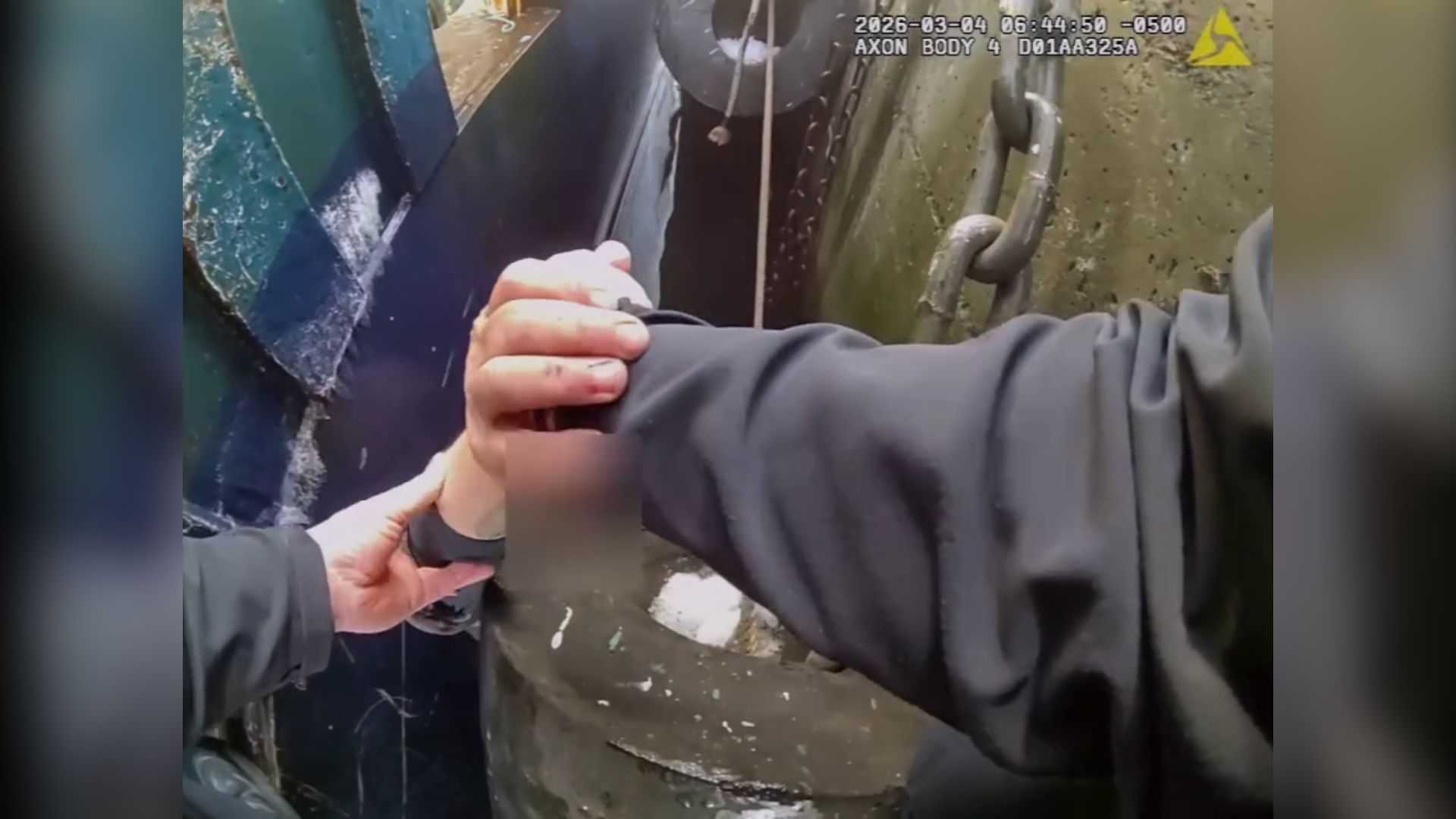Heroic moments were caught on camera in New Bedford, Massachusetts, on Wednesday morning after a fisherman fell out of his vessel and into frigid waters.According to the New Bedford Police Department, dispatch received a 911 call around 6:30 a.m. for a well-being check in the area of Fish Island.The 911 caller, later identified as the victim, had fallen into the freezing water between two fishing vessels and was unable to pull himself out.Officer Kenneth Almeida was the first to respond to the scene.Body camera video provided by the New Bedford Police Department shows Officer Almeida running from his cruiser and grabbing hold of the victim’s hand. The officer reassured that he wasn’t letting go and that a crew was ready to hoist the victim to safety.Officers Mackenzie Sylvester, Abraham Nazario, Andy Soares, and Jesse Branagan arrived and together pulled the victim from the frigid water.The victim was transported to a hospital for treatment. He is expected to be okay.”We commend all of the responding officers for their quick thinking, teamwork, and decisive action,” the New Bedford Police Department wrote in a social media post. “Their coordinated efforts ensured the fisherman was quickly located and safely removed from the freezing water so he could receive medical care.”